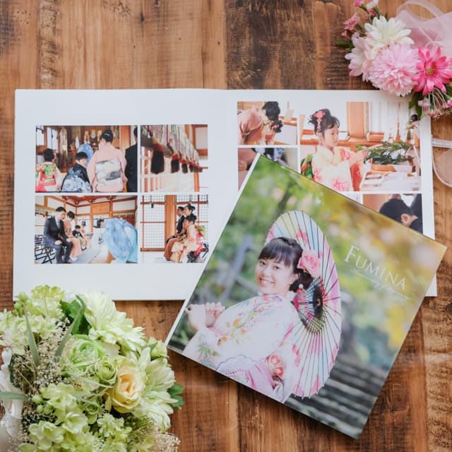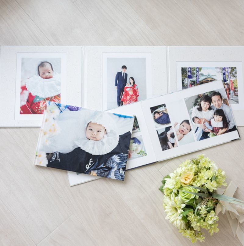 表紙、裏表紙、見開きと計4ページに10枚前後のお写真をレイアウトした台紙が付く一番人気のプランです!(一般的な3面台紙への変更も可能です)