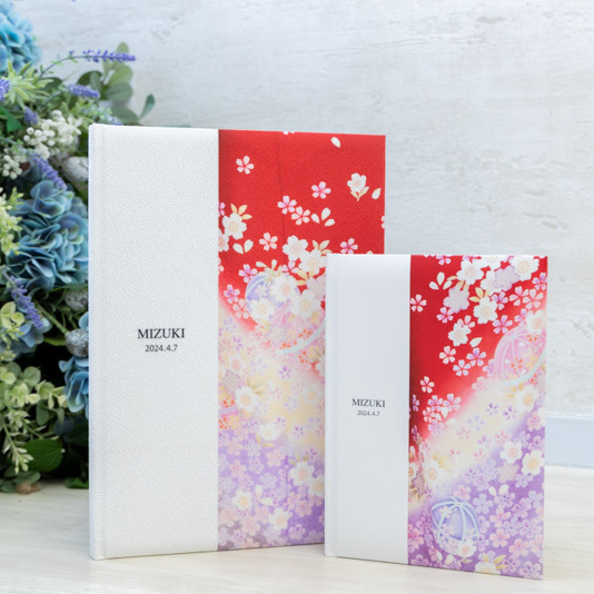 ちりめん素材の表紙にお着物の柄を合わせた模様を印刷。本文用紙は厚みのある用紙を使用。