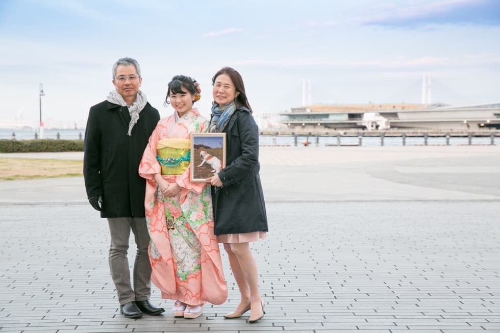 たまたま娘が成人式を迎え私の古い振袖を着たいといってくれたので記念写真を自分で手配することになりました。そうだ、この機会に是非純子さんに記念写真をお願いしようと思い立ったのです。娘の要望で家族とそしてずっと仲良しのお友達も飼っている犬も一緒に撮りたい、今は2人とも地方の大学に進学して遠く離れてしまっている横浜でせっかく撮るのだから、大好きな横浜らしい場所で写真撮りたい、と。